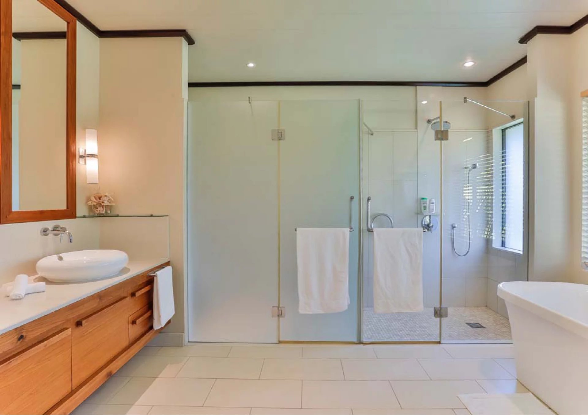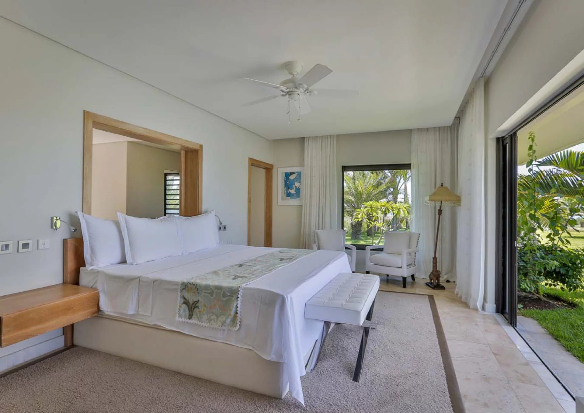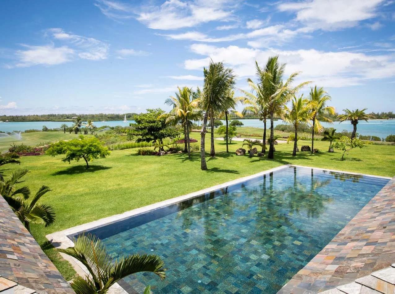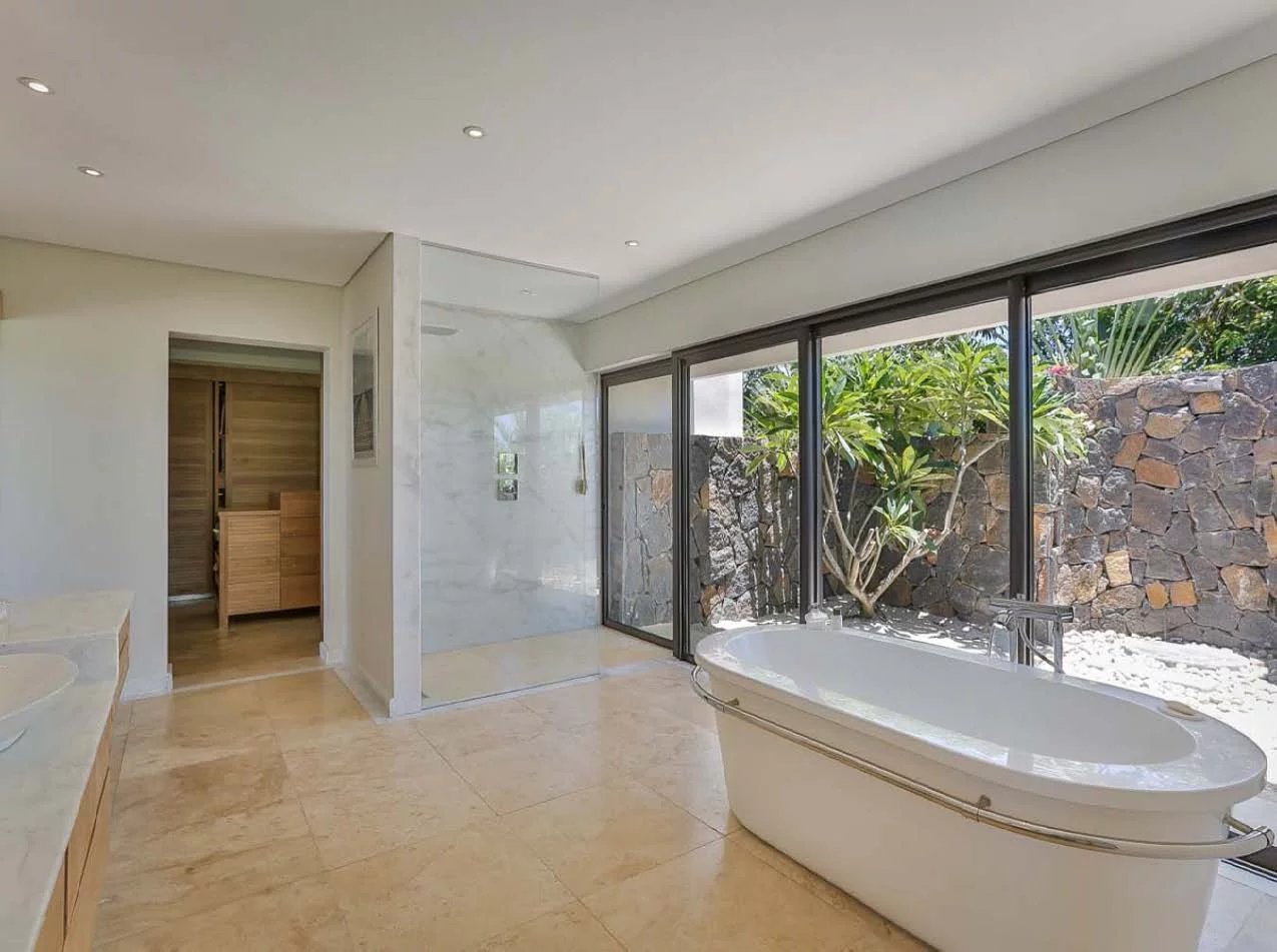 Les vastes espaces de réception sont baignés de lumière, tandis que l’architecture contemporaine privilégie la fluidité et les larges ouvertures. Celles-ci prolongent naturellement les pièces de vie vers l’extérieur, où la terrasse, la piscine et le jardin paysager créent un environnement intime et apaisant, parfaitement adapté au climat mauricien.